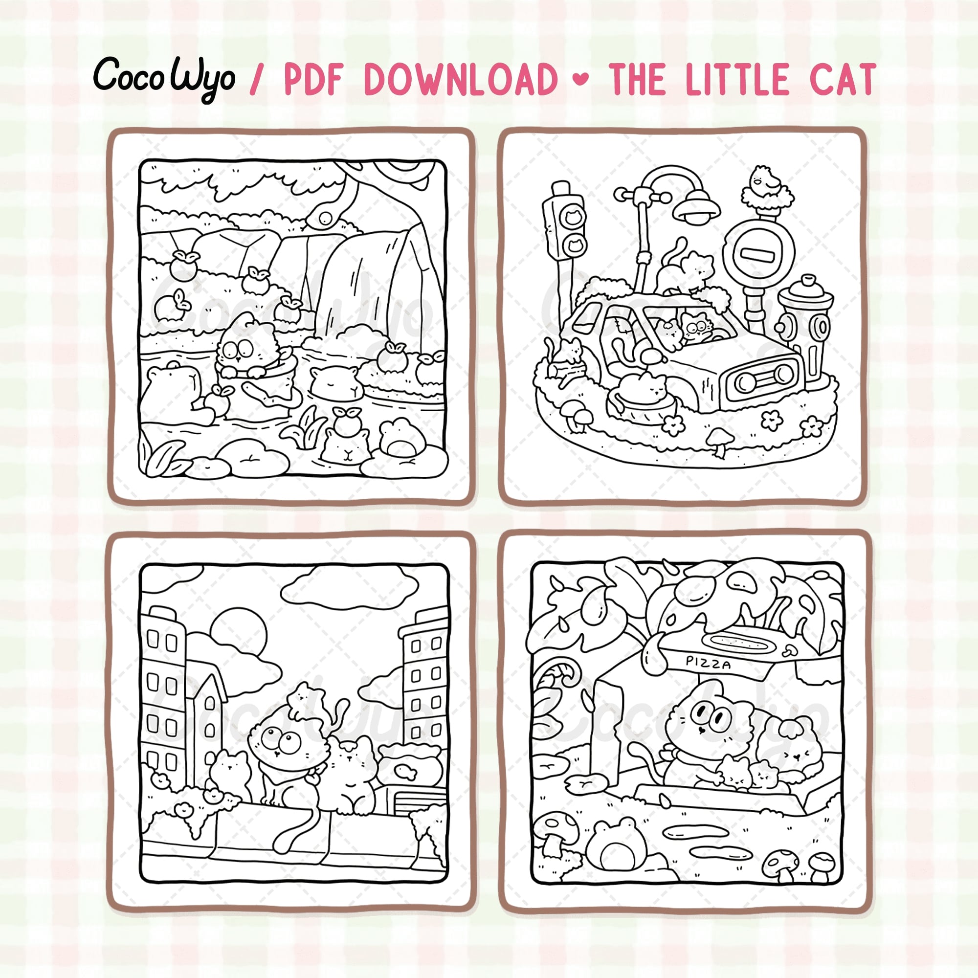 Get cozy with this 6-page mini set from The Little Cat coloring book. Follow a sweet little kitten as it explores a quiet forest stream, plays curiously around an old car, or quietly watching the city go by. Each page invites you into a peaceful, heartwarming moment where your colors can bring the story to life.